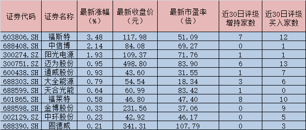同花順數(shù)據(jù)顯示,截至3月29日,A股風電、光伏板塊合計共有66只成份股。其中,有30只個股近30日內(nèi)受到機構給予“買入”或“增持”等看好評級,而邁為股份、福斯特、福萊特、金風科技、金博股份、大全能源、運達股份、通威股份、隆基股份、晶盛機電、晶科能源、中環(huán)股份等12只個股獲得5家及以上機構聯(lián)袂看好。