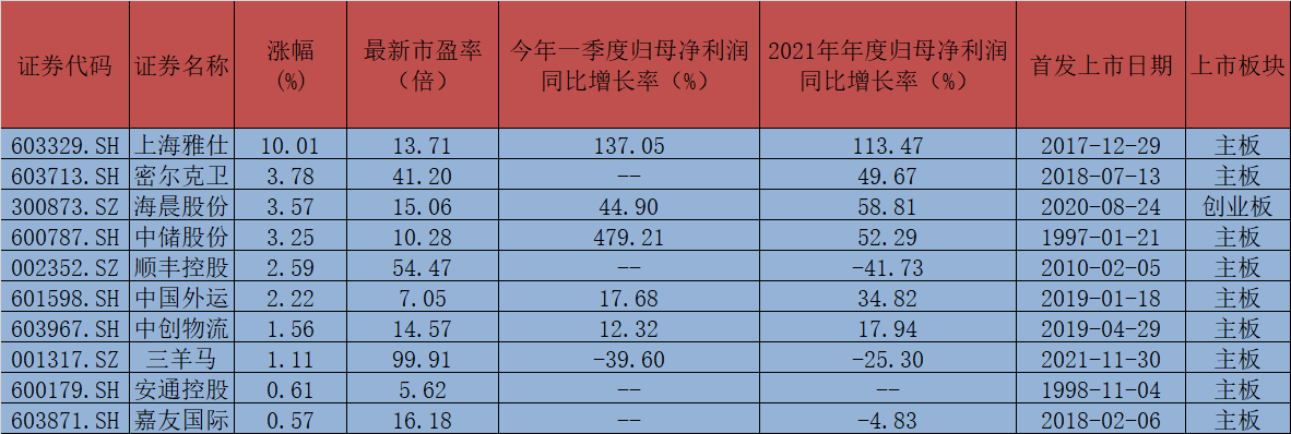 進一步梳理發(fā)現(xiàn),中儲股份、上海雅仕、圓通速遞、韻達股份、飛力達、音飛儲存、海晨股份、華貿(mào)物流、中國外運、中創(chuàng)物流、嘉誠國際等11家公司2021年以及今年一季度歸母凈利潤均實現(xiàn)同比增長。