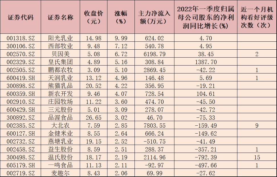 表:5月23日乳業(yè)板塊內(nèi)漲幅超2%的個股一覽