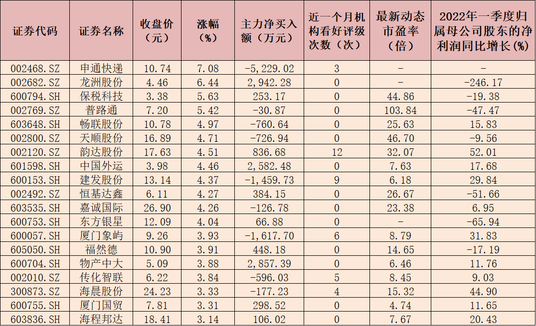 業(yè)績來看,同花順數(shù)據(jù)顯示,物流板塊內(nèi)有28家公司今年一季度歸母凈利潤實(shí)現(xiàn)同比增長,占比近六成,其中,圓通速遞、中儲股份、原尚股份、上海雅仕、東航物流等5家公司今年一季度歸母凈利潤實(shí)現(xiàn)同比翻番。