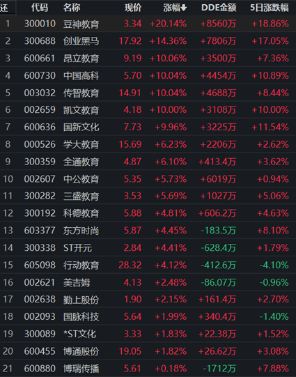 從個股來看,教育板塊21只交易中的個股全線上漲,其中,有6只個股漲停報收。