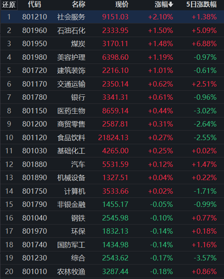 從申萬一級行業(yè)看,有14個行業(yè)上漲,社會服務(wù)行業(yè)領(lǐng)漲,漲幅達2.10%,另有包括石油石化與煤炭等在內(nèi)的四行業(yè)漲幅均在1%以上。此外,輕工制造行業(yè)跌幅居首,達0.83%。