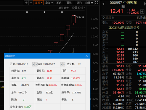5月27日,中通客車繼續(xù)強勢上漲,開盤12分鐘封住漲停,截至收盤,封板買一單達105742手。該股自5月12日以來連續(xù)12日上漲,累計上漲190.63%,最近11個交易日連續(xù)拉漲停板。