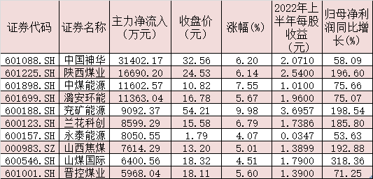 表:9月5日主力資金凈流入超5000萬元的煤炭股
