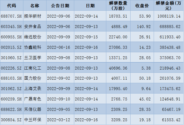 表:本周解禁金額前十位(上周收盤價(jià)計(jì)算)