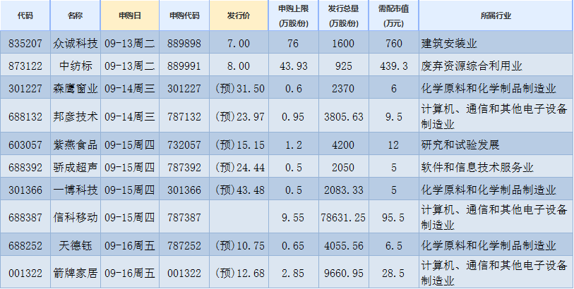 新股方面,根據(jù)發(fā)行安排,A股市場(chǎng)本周(9月13日-9月16日)將有10只新股申購(gòu)。