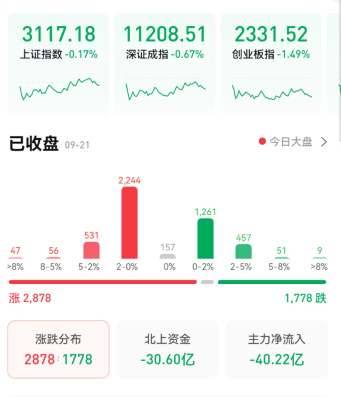 9月21日,A股三大指數(shù)震蕩回落,集體收跌。截至收盤(pán),上證指數(shù)微跌0.17%報(bào)3117.18點(diǎn),深證成指跌0.67%報(bào)11208.51點(diǎn),創(chuàng)業(yè)板指跌1.49%報(bào)2331.52點(diǎn),兩市合計(jì)成交6359億元,北向資金凈賣(mài)出30.6億元??傮w來(lái)看,A股個(gè)股漲多跌少。