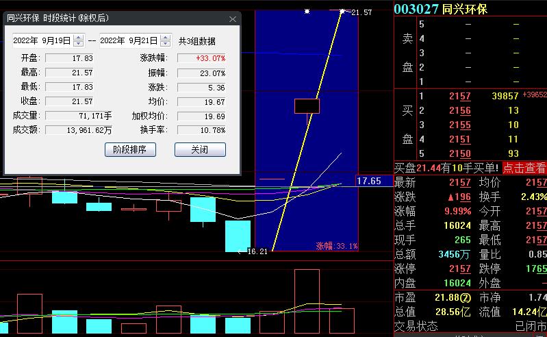9月21日,熱門(mén)股同興環(huán)保再度漲停,截至收盤(pán),報(bào)收21.57元,實(shí)現(xiàn)3連板,累計(jì)漲幅達(dá)33.07%。