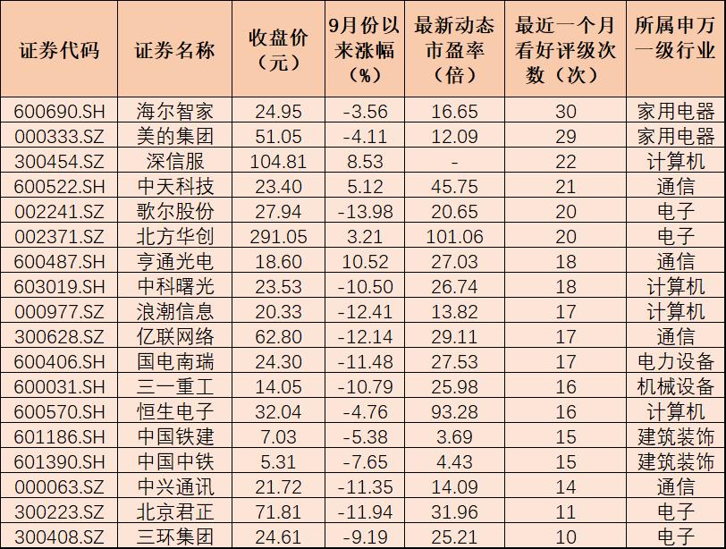 表:最近一個(gè)月獲機(jī)構(gòu)看好評級次數(shù)10次及以上個(gè)股一覽