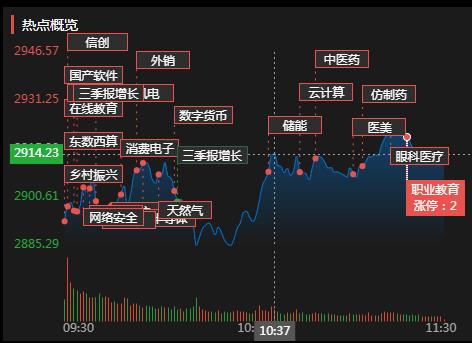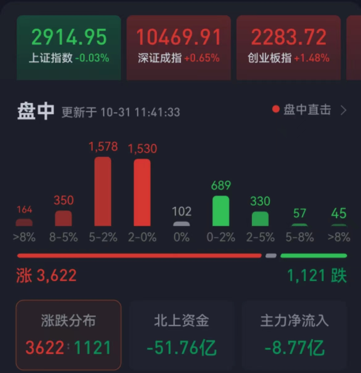 周一(10月31日),三大股指震蕩分化,漲跌不一。截至上午收盤,上證指數(shù)下跌0.03%,報2914.95點;深證成指和創(chuàng)業(yè)板指漲幅分別為0.65%和1.48%;滬深兩市合計成交額5808.76億元,總體來看,兩市個股漲多跌少。
