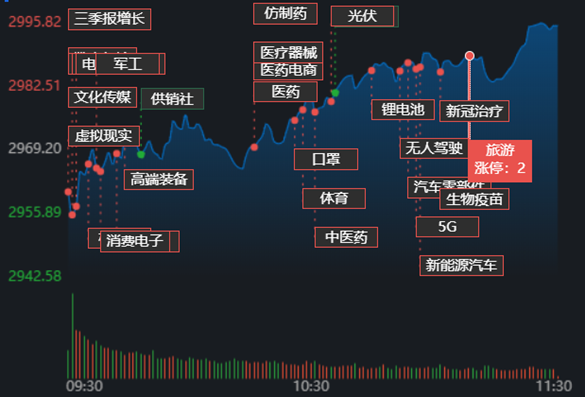 11月2日早盤,A股市場三大指數(shù)低開后震蕩走高,創(chuàng)業(yè)板指漲幅最大。截至上午11:30,上證指數(shù)漲0.88%,報2995.26點;深證成指和創(chuàng)業(yè)板指漲幅分別為1.10%和1.41%;滬深兩市合計成交額6077.9億元,較前一交易日增長2.86%。總體來看,A股市場個股漲多跌少,有73只個股漲停,跌停個股1只。