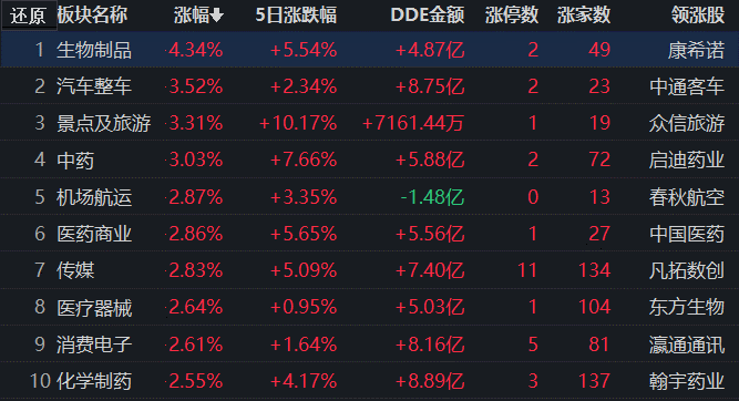 同花順行業(yè)方面,截至11月2日11:30,76類行業(yè)中74類上漲,占比97.37%,其中,生物制品漲幅居首,達4.34%,此外,汽車整車、景點及旅游、中藥等行業(yè)漲幅均超3%。下跌的行業(yè)中,銀行居首,跌幅達0.82%。