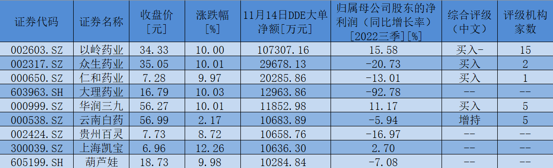 表:11月14日,獲大單資金凈流入額超1億元的中藥板塊個(gè)股一覽