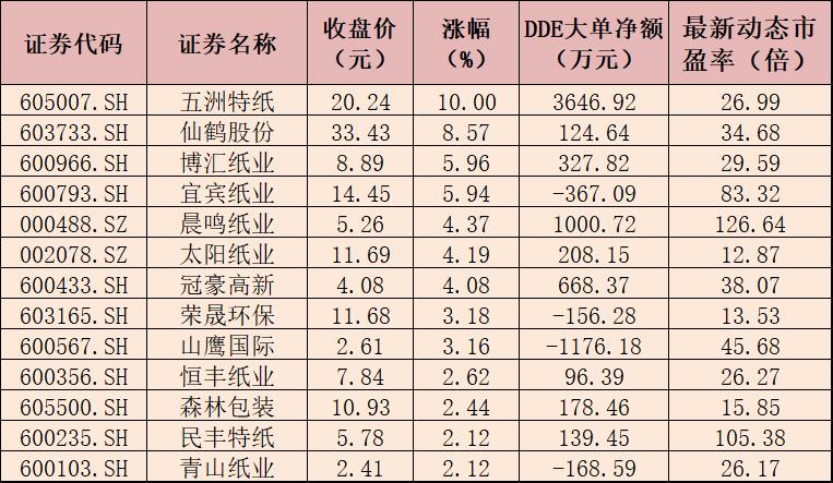 與此同時(shí),部分造紙股也獲得市場(chǎng)大單資金的青睞。12月13日,板塊內(nèi)有10只個(gè)股呈現(xiàn)大單資金凈流入態(tài)勢(shì),合計(jì)凈流入額為6505.35萬元,其中,五洲特紙獲大單資金凈買入額最多,為3646.92萬元,其次是晨鳴紙業(yè)和冠豪高新,分別為1000.72萬元和668.37萬元。