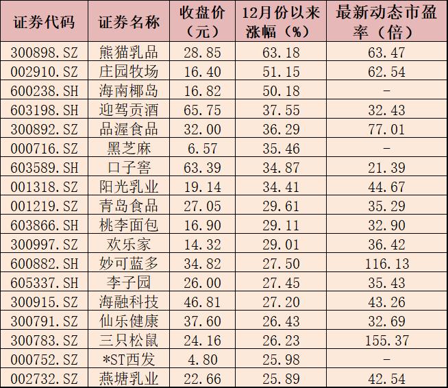 表:12月份以來漲幅超25%的食品飲料股一覽