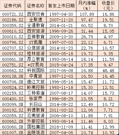 表:月內(nèi)累計(jì)漲幅超10%的社會(huì)服務(wù)板塊個(gè)股
