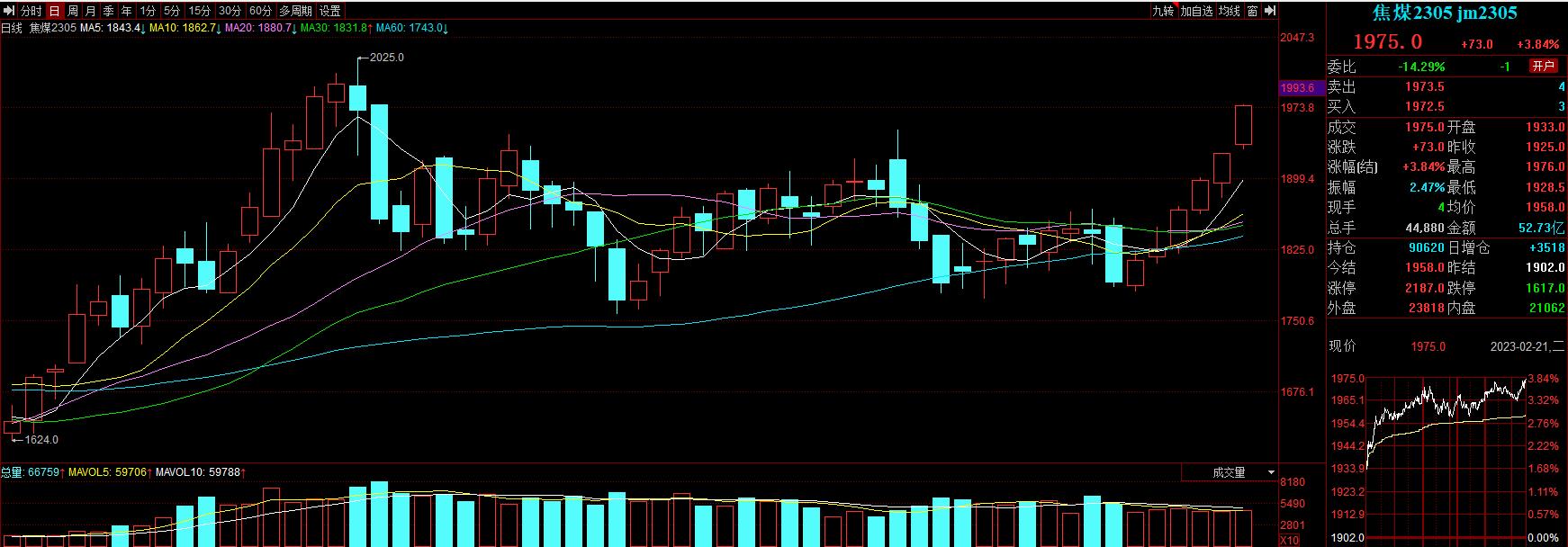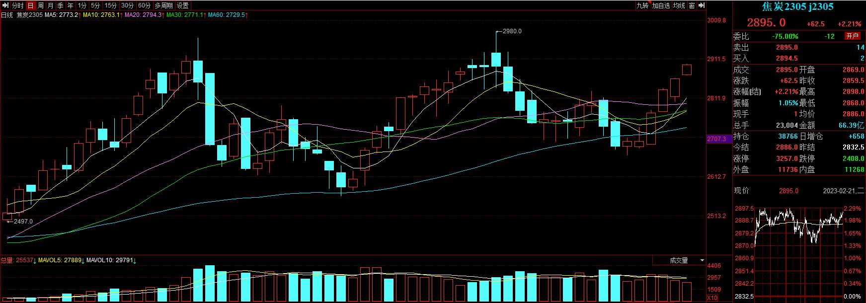 2月21日,煤炭期貨主力合約表現(xiàn)搶眼,“雙焦”期貨主力合約實(shí)現(xiàn)六連陽(yáng)。具體來(lái)看,今日焦煤期貨主力合約連續(xù)第6個(gè)交易日上漲,該主力合約盤(pán)中最高上探至1976元/噸,截至收盤(pán),漲幅達(dá)3.84%,報(bào)收1975元/噸。同時(shí),焦炭期貨主力合約也持續(xù)活躍,2月21日該主力合約漲2.21%,日線(xiàn)實(shí)現(xiàn)六連陽(yáng),報(bào)收2895元/噸。