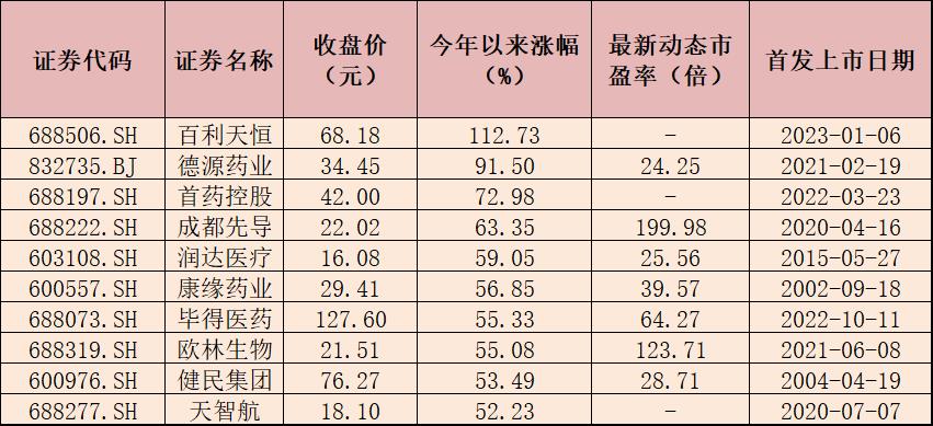 表:今年以來漲幅居前十的醫(yī)藥股一覽