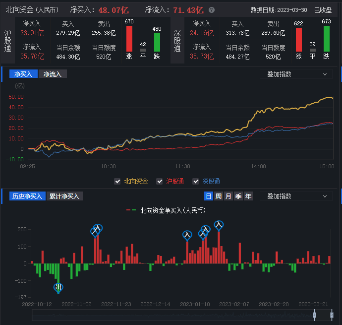 3月30日,兩市股指早盤震蕩回落,午后回升轉(zhuǎn)漲,創(chuàng)業(yè)板指震蕩上行。北向資金全天凈買入超40億元。業(yè)內(nèi)人士表示,當(dāng)前A股市場的各路機(jī)構(gòu)資金有望形成合力做多的態(tài)勢。