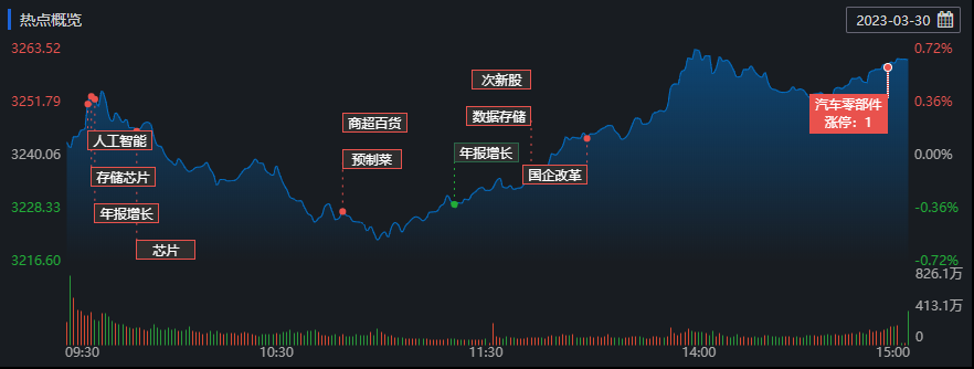 3月30日,A股三大指數(shù)走出”V”字反轉(zhuǎn),集體收漲,滬指結(jié)束四連跌。截至收盤,上證指數(shù)漲0.65%報3261.25點;深證成指漲0.62%報11651.83點,創(chuàng)業(yè)板指漲0.50%報2383.04點,A股合計成交額9448.25億元,較上個交易日下降3.75%;北向資金全天凈買入48.07億元;其中滬股通凈買入23.91億元,深股通凈買入24.16億元。今日A股中有2949只下跌,1933只上漲。