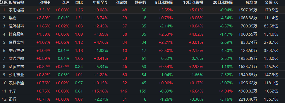 3月30日,行業(yè)漲多跌少,從31類申萬一級行業(yè)看,有25類行業(yè)上漲,占比超八成,家用電器午后爆發(fā)漲幅居首,漲幅達(dá)3.31%;煤炭居第二位,漲2.89%;另有建筑材料、社會服務(wù)、食品飲料、美容護(hù)理等4類行業(yè)均漲超1%。6類下跌行業(yè)中,通信領(lǐng)跌,跌幅為3.11%;計算機(jī)、傳媒、環(huán)保、綜合、紡織服飾等5類行業(yè)分別下跌2.08%、1.39%、0.52%、0.12%、0.01%。