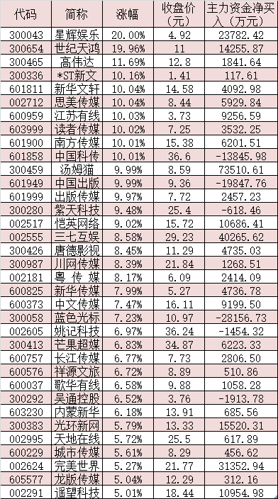 表:4月24日漲幅超5%的文化傳媒股