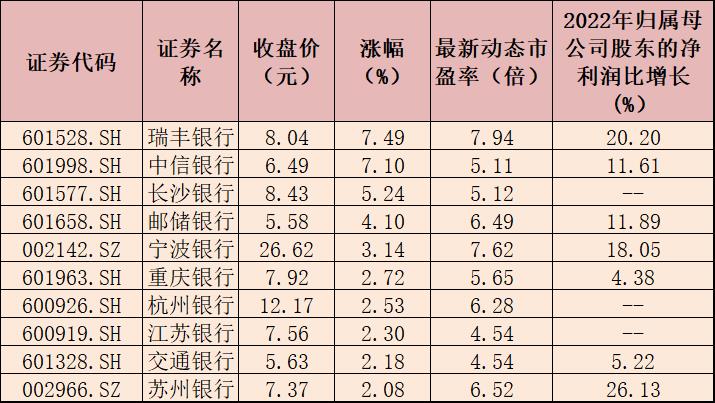 從業(yè)績上看,截至4月25日收盤,銀行板塊有26家公司發(fā)布了2022年年報(bào),有24家公司去年凈利潤實(shí)現(xiàn)同比增長,占比超九成,其中,張家港行、江陰銀行、無錫銀行、蘇州銀行、常熟銀行、平安銀行、瑞豐銀行等7家公司去年歸母凈利潤同比增長均超20%。此外,蘇州銀行、常熟銀行、平安銀行等3家公司率先披露了今年一季報(bào),3家公司今年一季度歸母凈利潤均實(shí)現(xiàn)同比增長。