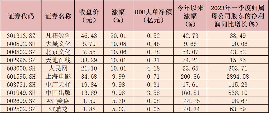 6月5日,傳媒板塊走強,截至收盤,傳媒板塊漲3.43%,位列同花順板塊漲幅榜第三,其中,包括凡拓數(shù)創(chuàng)、大晟文化、北京文化、天地在線、人民網(wǎng)等在內(nèi)10只概念股集體漲停。
