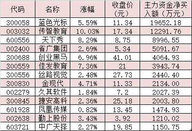 同時(shí),職業(yè)教育板塊內(nèi)共有31只概念股呈現(xiàn)大單資金凈買入態(tài)勢(shì)。其中,藍(lán)色光標(biāo)、傳智教育最受追捧,分別達(dá)到19652.18萬(wàn)元、12291.76萬(wàn)元,天下秀、省廣集團(tuán)、創(chuàng)業(yè)黑馬、佳發(fā)教育、絲路視覺(jué)、金現(xiàn)代、久其軟件、捷安高科等8只概念股均獲得2000萬(wàn)元以上大單資金凈買入,這10只概念股合計(jì)吸金6.26億元。