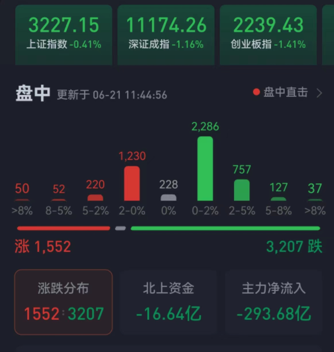 周三(6月21日),三大股指繼續(xù)震蕩回落。截至上午收盤,上證指數(shù)跌0.41%,報3227.15點;深證成指和創(chuàng)業(yè)板指跌幅分別為1.16%和1.41%;滬深兩市合計成交額6487.6億元,總體來看,兩市個股跌多漲少。