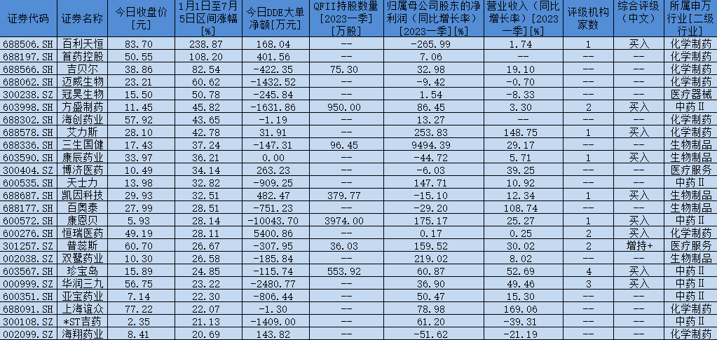 表:2023年1月1日至7月5日,創(chuàng)新藥板塊期間累計上漲超20%個股一覽