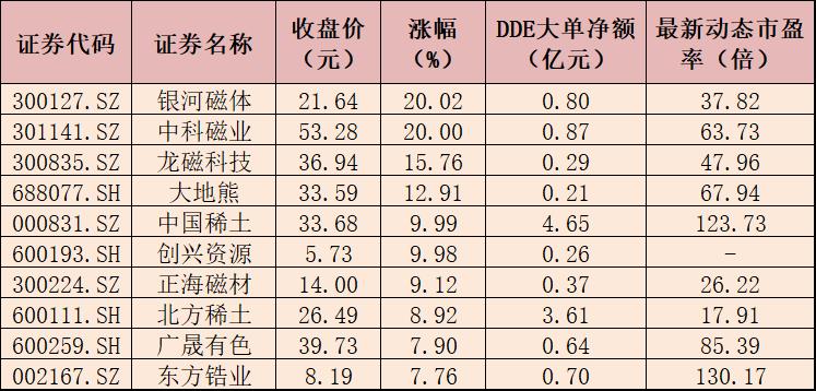 表:7月5日漲幅居前十的稀土永磁概念股一覽