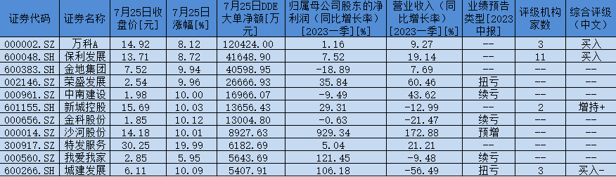 表:7月25日,房地產(chǎn)行業(yè)獲大單資金凈流入額超5000萬元個(gè)股一覽