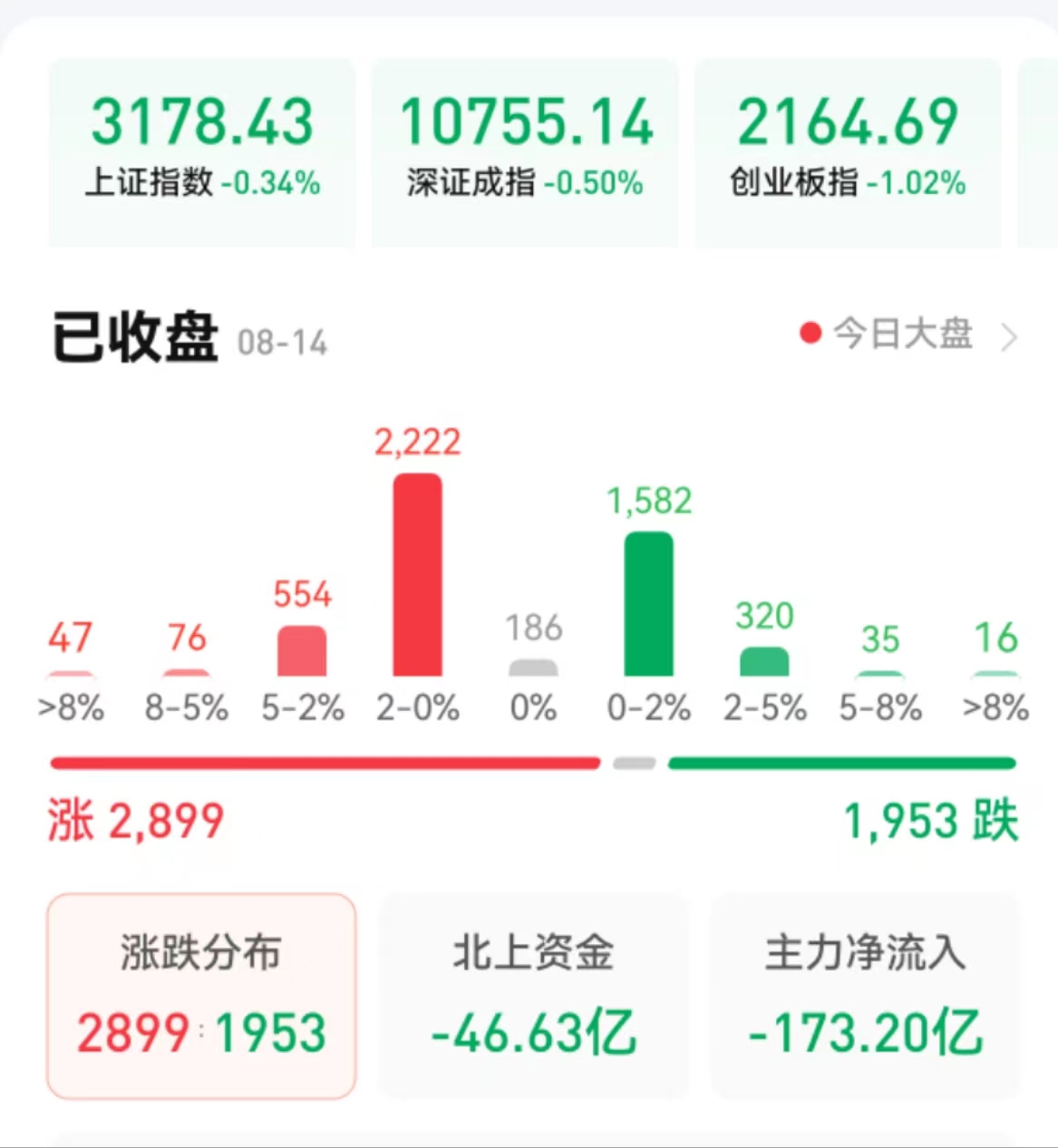 周一(8月14日),A股三大股指震蕩下行,全線飄綠。截至收盤,上證指數(shù)跌0.34%報3178.43點,深證成指跌0.50%報10755.14點,創(chuàng)業(yè)板指跌1.02%報2164.69點;兩市合計成交金額達7419.61億元。總體上看,兩市個股漲多跌少。其中,漲停個股達36只,跌停個股達7只。