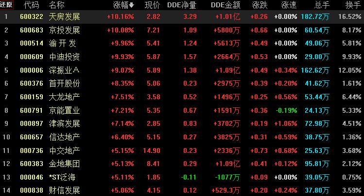 具體看,截至8月16日上午收盤,房地產(chǎn)開發(fā)板塊漲幅居首,達(dá)3.22%,資金凈流入92.37億元。其中,天房發(fā)展、京投發(fā)展、渝開發(fā)、中迪投資等個(gè)股紛紛漲停。