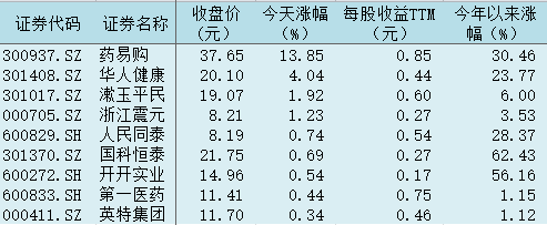截至8月23日收盤(pán),SPD指數(shù)漲0.52%,板塊內(nèi)漲幅居前的個(gè)股中,藥易購(gòu)上漲13.85%,盤(pán)中一度20CM漲停;華人健康漲4.04%,盤(pán)中一度漲超10%。板塊內(nèi)21只個(gè)股中,共有9只收漲,占比超四成。