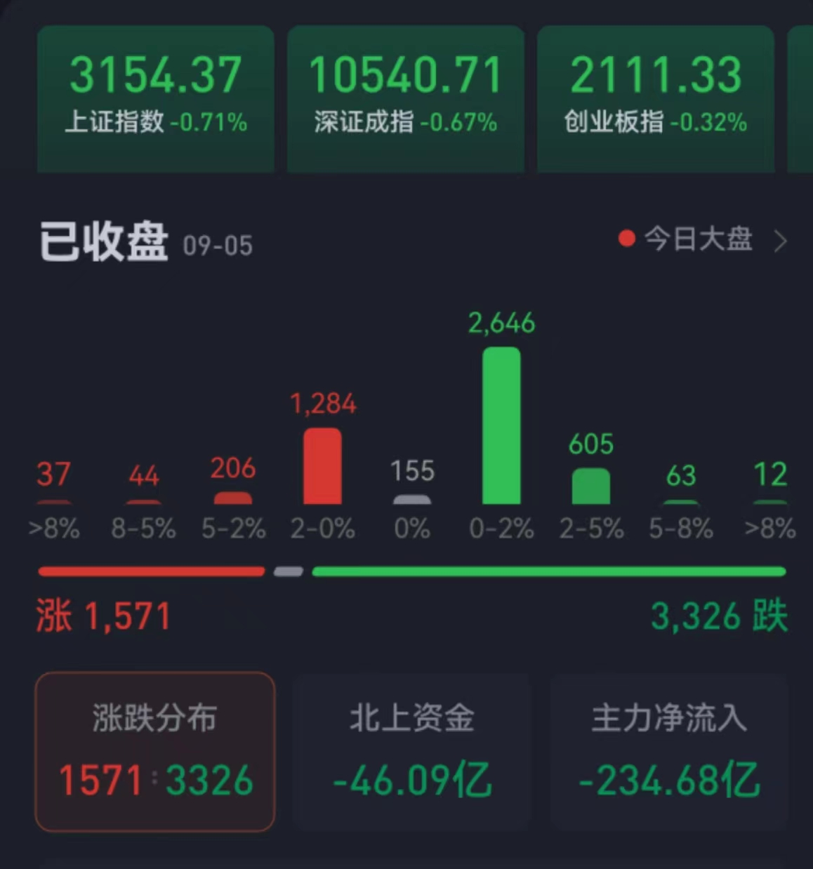 周二(9月5日),A股三大股指震蕩回落。截至收盤,上證指數(shù)跌0.71%報3154.37點,深證成指跌0.67%報10540.71點,創(chuàng)業(yè)板指跌0.32%報2111.33點;兩市合計成交金額達(dá)8038.57億元,北向資金凈賣出46.09億元??傮w上看,兩市個股跌多漲少。其中,漲停個股達(dá)23只,跌停個股達(dá)5只。