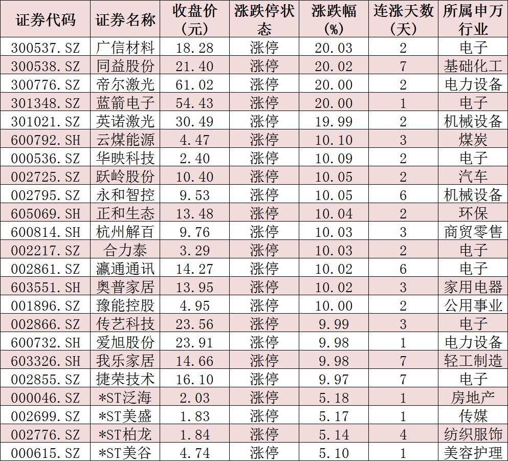 具體來看,今日,光伏概念股集體反彈,其中,BC電池板塊領(lǐng)漲,永和智控等6只概念股漲停;TOPCON電池板塊表現(xiàn)強(qiáng)勢,帝爾激光等3只概念股漲停;光刻膠股全天強(qiáng)勢,廣信材料、同益股份漲停;消費電子概念股盤中異動,傳藝科技等4只概念股漲停;華為概念股繼續(xù)活躍,捷榮技術(shù)等3只概念股漲停;HJT電池、電子化學(xué)品、電子紙、鈣鈦礦電池、存儲芯片、光學(xué)光電子、廚衛(wèi)電器、電力等板塊表現(xiàn)活躍。房地產(chǎn)服務(wù)板塊領(lǐng)跌,租售同權(quán)、房地產(chǎn)開發(fā)、傳媒等板塊跌幅居前。