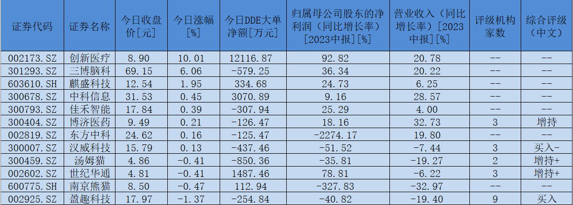 表:9月20日,同花順腦機(jī)接口概念板塊個股行情一覽