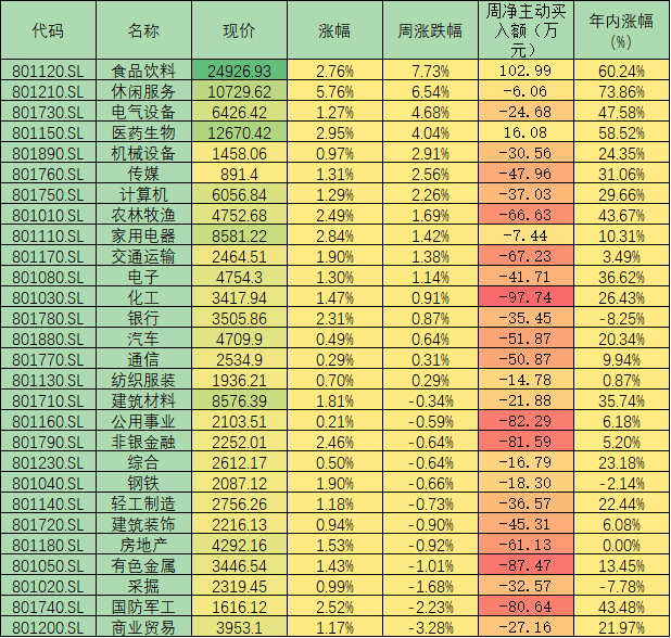 從盤面表現(xiàn)來看,本周兩市A股共2393只上漲,上漲股占比60.61%。行業(yè)板塊方面,有16類行業(yè)上漲,占比57.14%,食品飲料(7.73%)、休閑服務(wù)(6.54%)、電氣設(shè)備(4.68%)等周漲幅居前三位。