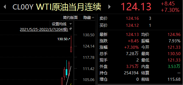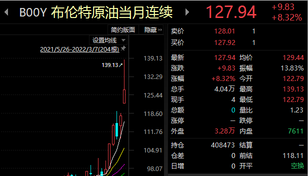 北京時間3月7日,美、布原油期貨再次迎來大漲。其中,布倫特原油一度漲逾10%,升至139.13美元/桶,而WTI原油期貨則突破130美元/桶。截至11點12分記者發(fā)稿,布倫特原油和WTI原油分別報128.77美元/桶、124.40美元/桶,今年以來累計漲幅均超65%。