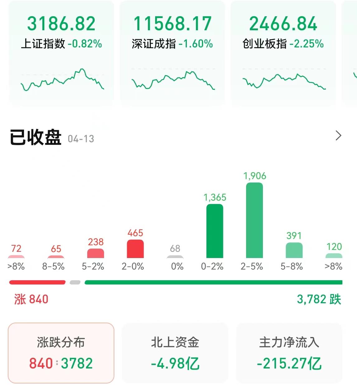 4月13日,A股三大指數(shù)呈現(xiàn)震蕩回落態(tài)勢(shì)。截至收盤,上證指數(shù)跌0.82%報(bào)3186.82點(diǎn),深證成指跌1.6%報(bào)11568.17點(diǎn),創(chuàng)業(yè)板指跌2.25%報(bào)2466.84點(diǎn);兩市合計(jì)成交8734億元,北向資金凈賣出4.98億元。