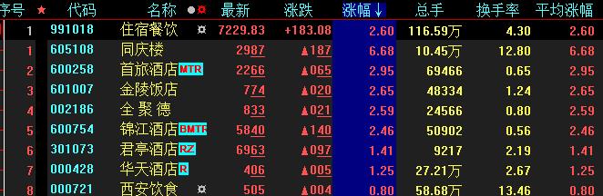 具體看,截至10月27日上午收盤,住宿餐飲板塊漲幅居首,達(dá)2.6%。其中,同慶樓漲幅達(dá)6.68%。