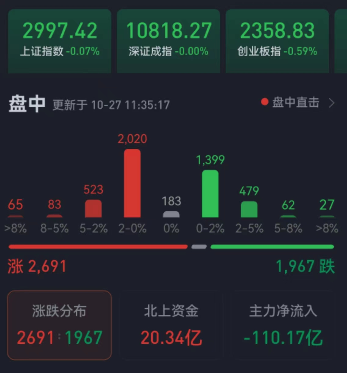 周四(10月27日),三大股指震蕩回落。截至上午收盤,上證指數(shù)跌幅為0.07%,報2997.42點(diǎn);深證成指和創(chuàng)業(yè)板指跌幅分別為0.0%和0.59%;滬深兩市合計(jì)成交額5717.6億元,總體來看,兩市個股漲多跌少。