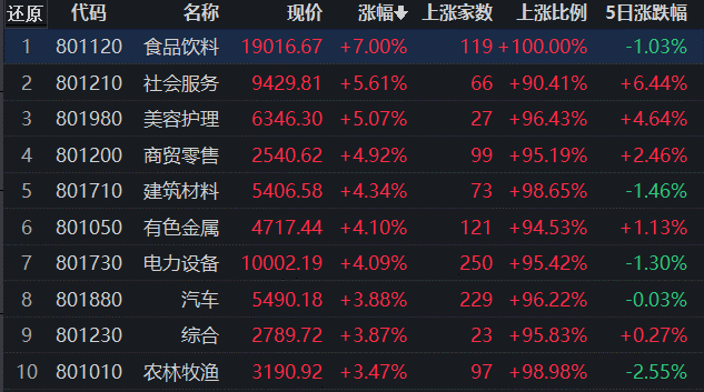 31類申萬一級行業(yè)中,有30類上漲,占比96.77%,其中,食品飲料漲7%,居首;下跌方面,僅國防軍工行業(yè)下跌,跌幅0.54%。