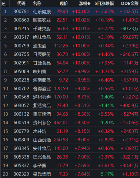 申萬一級行業(yè)中食品飲料行業(yè)領(lǐng)漲,漲幅達(dá)7.00%,獲得43億元大單資金的凈流入,居第一位。行業(yè)119只交易中的個股全線上漲,其中,51只個股漲幅超5%。