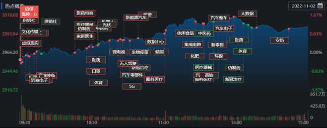 截至11月2日收盤,上證指數(shù)漲1.15%,收?qǐng)?bào)3003.37點(diǎn),深證成指漲1.33%,收?qǐng)?bào)10877.51點(diǎn),創(chuàng)業(yè)板指漲1.63%,收?qǐng)?bào)2375.86點(diǎn);滬深兩市合計(jì)成交額10521.4億元,較前一交易日增長(zhǎng)7.63%;北向資金凈賣出75.82億元;總體來看,A股中上漲個(gè)股為3568只,下跌個(gè)股1072只。