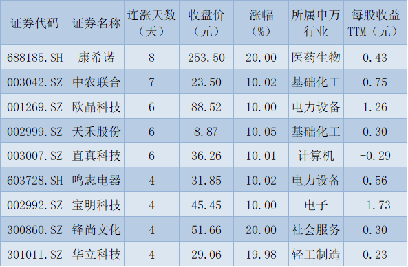 表:連續(xù)上漲4天且今日收盤漲停股一覽