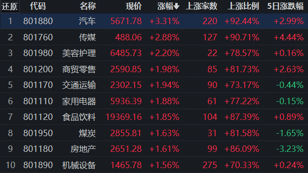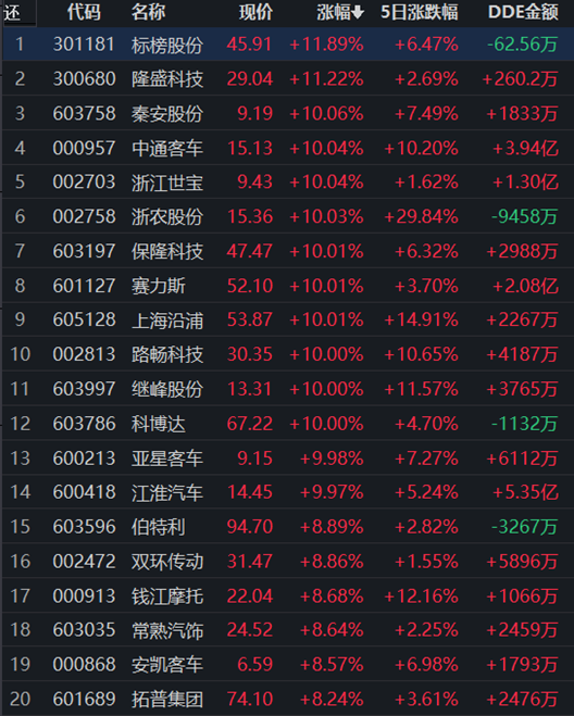 具體來看,汽車行業(yè)領(lǐng)漲,漲幅達(dá)3.31%,獲得23.26億元大單資金的凈流入,居第一位。行業(yè)237只交易中的個(gè)股,有220只上漲,其中,45只個(gè)股漲幅超5%。