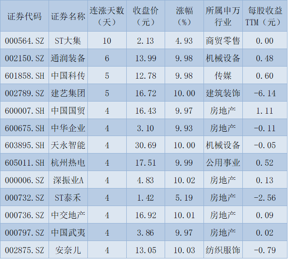 表:連續(xù)上漲4天且今日收盤漲停股一覽